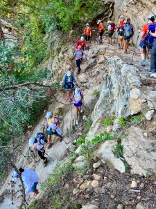 Following that steep descent, I was able to get some relief on my knee as the trail was somewhat flat. That is until we came to what is called Walter’s Wiggles, a series of 21 steep switchbacks. I could barely maneuver those switchbacks, so I added my own switchbacks within Walter’s Wiggles. After Walter’s Wiggles, I had to continue downhill to get to the lodge. I could see the group in the distance and was so frustrated with myself that I had fallen so far behind. By this time, Robyn had me tow her to take more weight off my knee. Towing is just what it sounds like. She pulled on the fanny pack I was wearing while I pulled her. I couldn’t believe it; this provided relief to my knee.