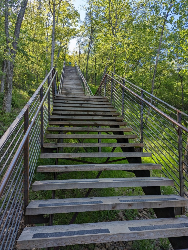 Following the nine-hour hike, we had to get ready for day two. Luckily, the second day only required a three-hour workout with one of those hours requiring a stair climb. The Coler Mountain Bike Preserve recently opened The Rise stairway in Bentonville and provided us with 185 steps, the equivalent of 11 flights of stairs. We love stairs.
